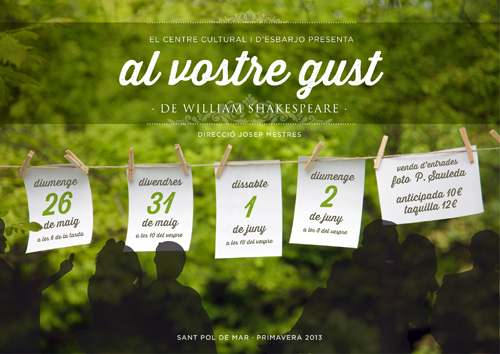 Representació de l'obra «Al vostre gust», de William Shakesperare (traducció de Salvador Oliva). A càrrec de l'Elenc Teatral del Centre Cultural, amb direcció de Josep Mestres.