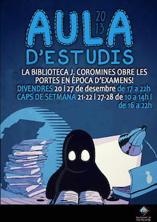 Així, aquest mes de desembre l'equipament estarà obert per als estudiants els divendres 20 i 27 de 17 a 22h, i els caps de setmana 21-22 i 27-28 de 10 a 14h i de 16 a 22h. En breu s'informarà del calendari d'obertura del mes de gener.