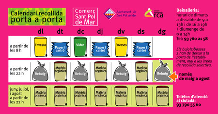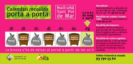 A partir del 14 de maig es varia el calendari de la recollida d'escombraries a Sant Pol de Mar. Aquest canvi s'ha fet després d'escoltar les opinions dels usuaris i pensant en facilitar el sistema de la recollida porta a porta.