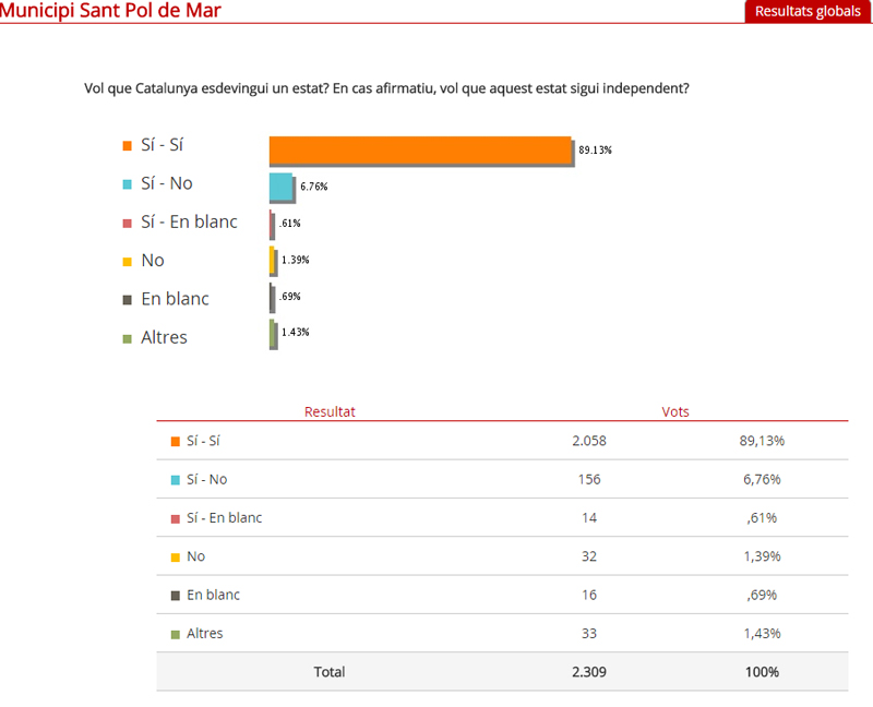 A Sant Pol s'ha imposat clarament el Sí+Sí, amb 2.058 vots (un 89%). Hi han votat 2.308 persones, el que representa prop d'un 60% de participació, una de les més altes del Maresme.
