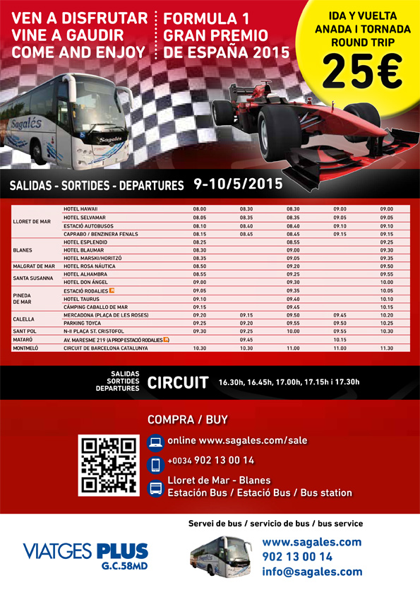 Els dies 8, 9 i 10 de maig se celebra el Gran Premi de FÒRMULA 1 al Circuit de Catalunya, i Viatges Plus, amb la col·laboració de Sagalés, facilita autobusos llançadora des de Lloret de Mar fins al Circuit de Barcelona-Catalunya (Montmeló), passant per diferents municipis de la Costa Brava i el Maresme Nord. El servei es realitza els dies de les carreres, és a dir, dissabte 9 i diumenge 10.