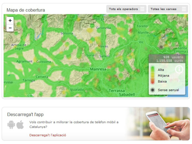 La Generalitat ha posat en marxa l'aplicació Cobertura mòbil, que pretén crear un mapa de la xarxa de telefonia al país amb la col·laboració dels usuaris de dispositius mòbils per identificar els punts que necessiten millorar la seva cobertura al territori. L'aplicació registra dades de nivell de cobertura per operadora (2G, 3G i 4G) i d'ubicació del dispositiu que s'utilitzen per confeccionar un mapa, disponible tant al mòbil com al web. Les dades es reben anònimament i són tractades de manera que no és possible identificar l'usuari que les facilita.