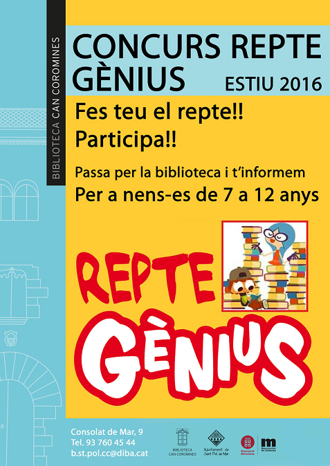 Afronta un nou repte, el de participar en el Concurs de lectura «Repte Gènius», per a infants d'entre 7 i 12 anys que organitza la biblioteca, i sigues un «LECTOR GENIAL».