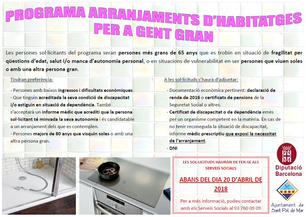 D'aquesta manera, les persones residents a Sant Pol majors de 65 anys que es trobin en una situació vulnerable, ja sigui per qüestions econòmiques, d'edat, salut i/o manca d'autonomia personal, podran obtenir aquestes ajudes econòmiques destinades principalment a renovar la banyera per un plat de dutxa o la cuina de gas butà per l'elèctrica. Unes reformes que, a més de suposar una millora en la qualitat de vida d'aquestes persones, impliquen una major eficiència energètica.