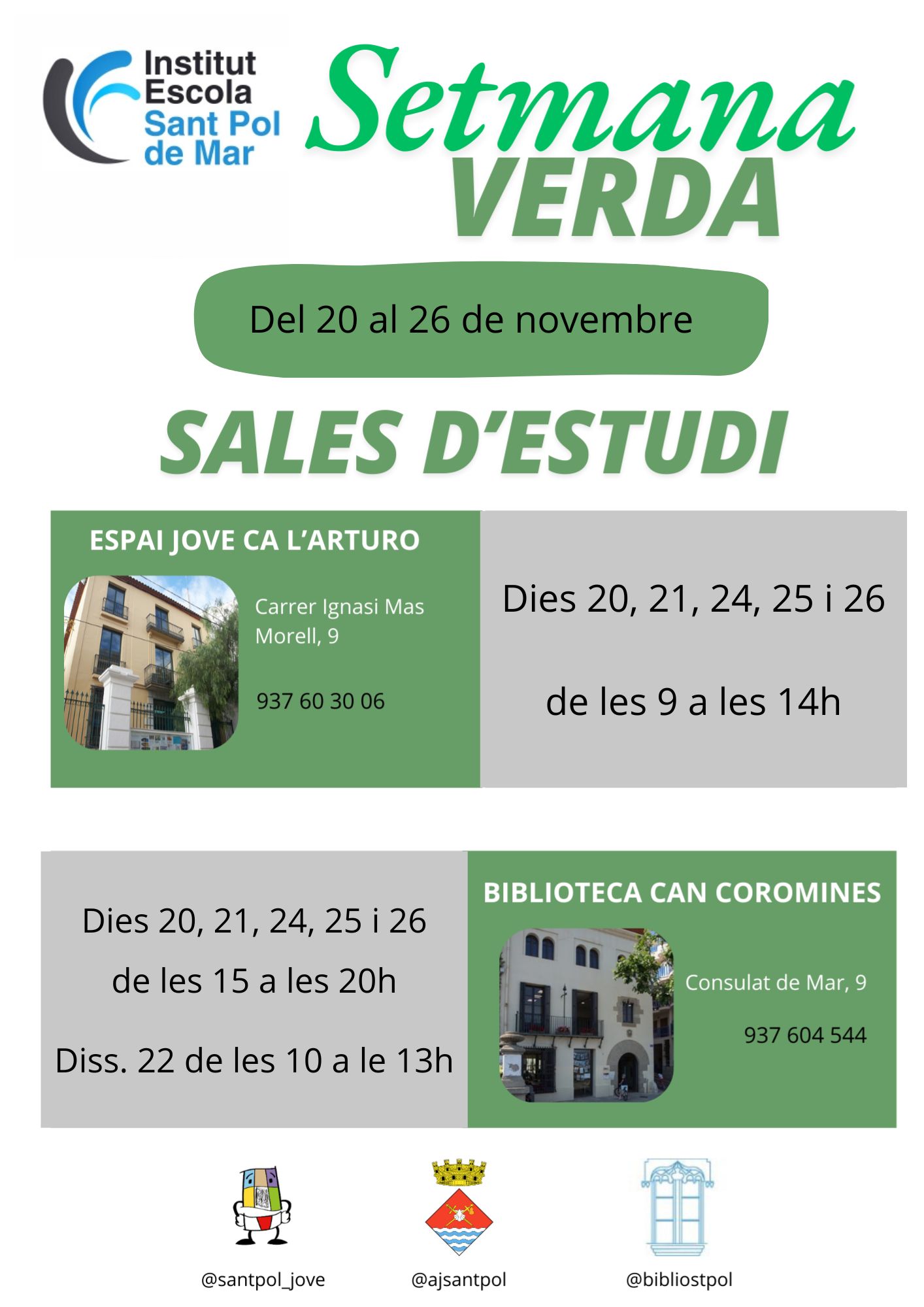 De cara a la Setmana Verda (setmana d'exàmens del 20 al 26 de novembre), ampliem els horaris de les sales d'estudi públiques. Si necessites un espai tranquil per estudiar, pren nota dels nous horaris!