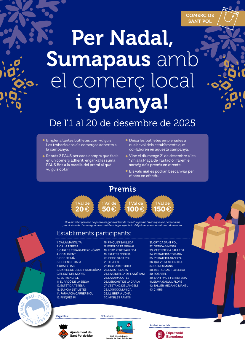 L'1 de desembre arrenca a Sant Pol de Mar una nova edició de la campanya de dinamització comercial Per Nadal, Sumapaus amb el comerç local i guanya!, una iniciativa impulsada per Comerç de Sant Pol amb el suport de diverses entitats locals.