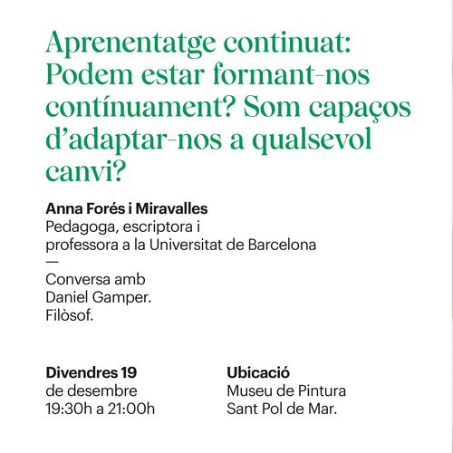 En aquesta ocasió comptarem amb Anna Forés, pedagoga, escriptora i professora a la UB, que conversarà amb el filòsof Daniel Gamper sota el títol: