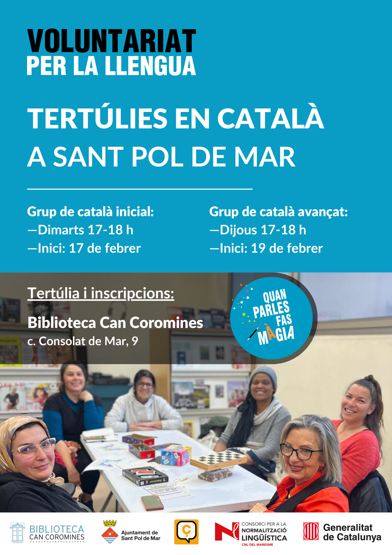 La Biblioteca Can Coromines de Sant Pol de Mar posarà en marxa, a partir del proper mes de febrer, dues noves sessions de tertúlies en català en el marc del programa del Voluntariat per la Llengua (VxL). Aquesta iniciativa té com a objectiu fomentar l’ús social del català i oferir espais de conversa distesos entre persones voluntàries i aprenents de la llengua.