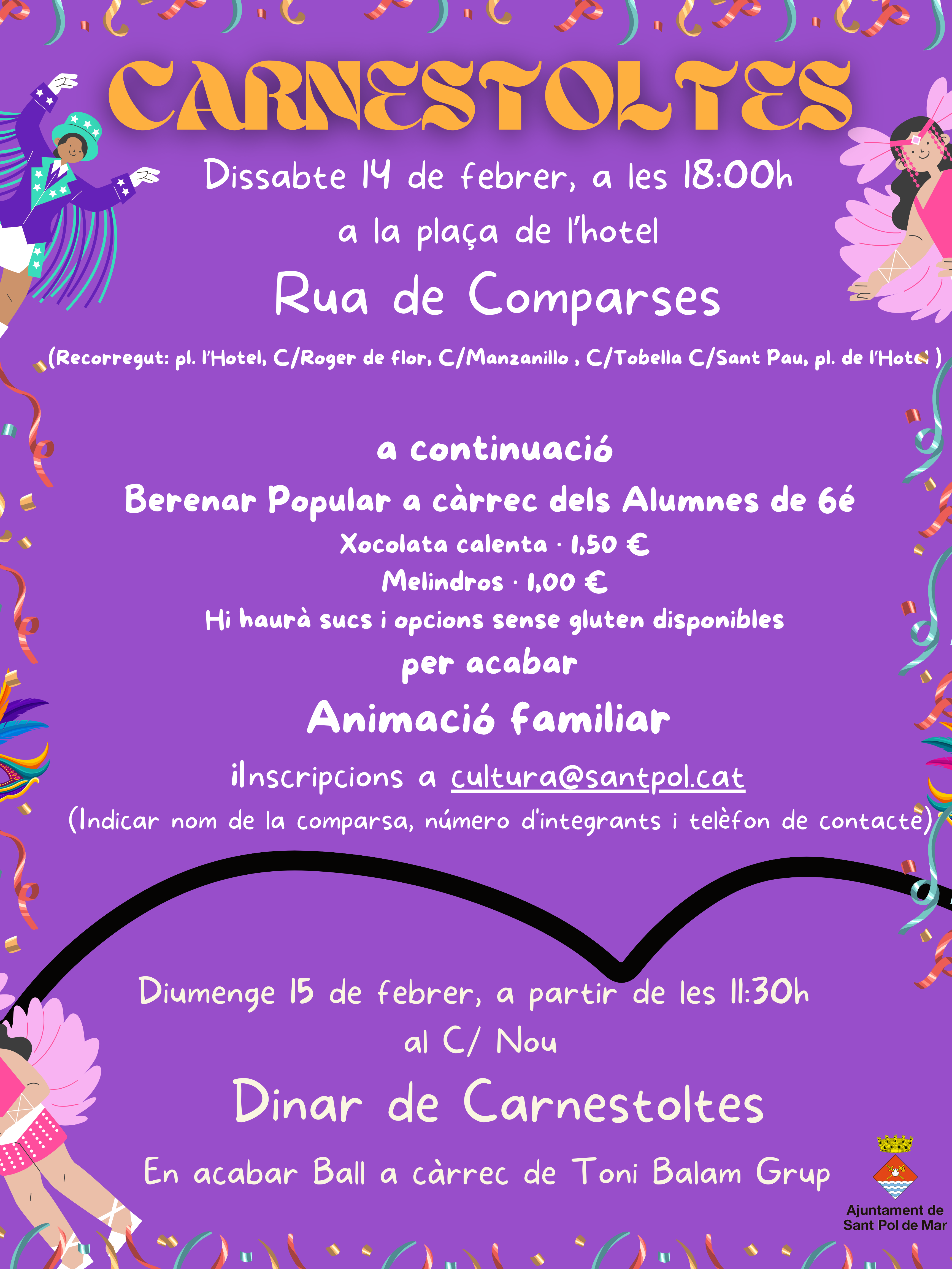Els actes començaran dissabte 14 de febrer a les 18.00 h a la plaça de l'Hotel, amb la tradicional Rua de Comparses. El recorregut previst serà: plaça de l'Hotel, carrer Roger de Flor, carrer Manzanillo, carrer Tobella, carrer Sant Pau i acabarà de nou a la plaça de l'Hotel.