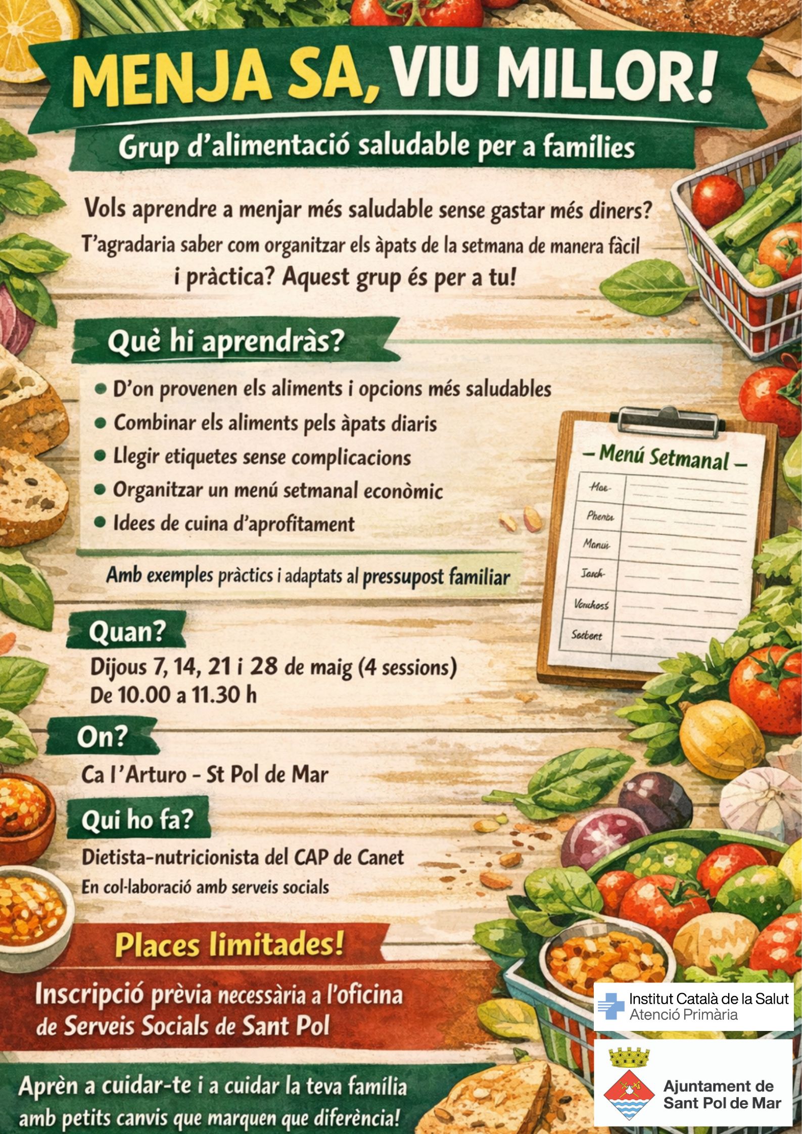 L’Ajuntament de Sant Pol de Mar posa en marxa un nou grup d’alimentació saludable adreçat a famílies amb l’objectiu de fomentar hàbits alimentaris més equilibrats i accessibles econòmicament. Sota el lema “Menja sa, viu millor!”, la iniciativa ofereix eines pràctiques per millorar la dieta diària sense incrementar la despesa.