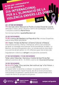 El 25 de novembre es van fer l'acte institucional amb la lectura del Manifest i enlairament de globus i, juntament amb l'associació Dones de la Vallalta es va oferir el documental Sophia - Mantente viva, un impactant testimoni sobre el fenomen de l'esclavitud i el maltractament que pateixen moltes dones actualment.
